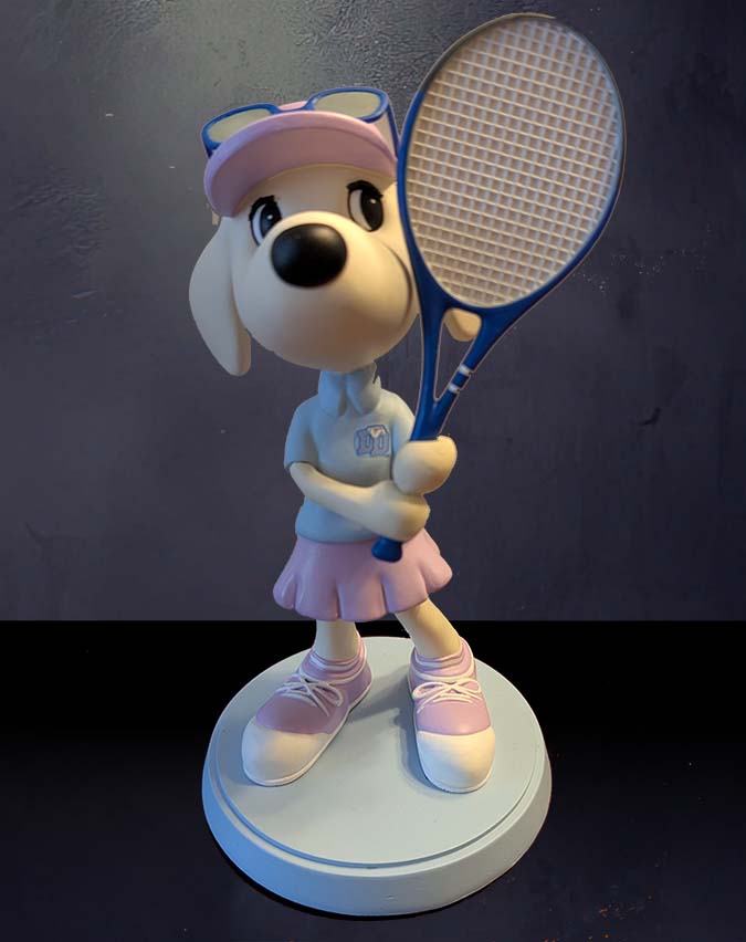 A lively tennis‑loving pup with bright court energy, this figurine steps forward in a pink cap, blue‑tinted shades, a sporty light‑blue top, and a matching skirt. With a blue racket in paw and crisp pink‑and‑white sneakers, it brings a fun, confident “game on” attitude to any collector’s display.